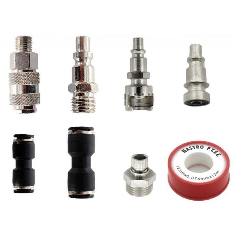 Kit di raccordi compresi nella confezione: - Raccordo rapido di uscita femmina di scorta/ricambio per compressore - Raccordo rapido di uscita maschio - Raccordo rapido maschio per la trasformazione di tutti gli attrezzi dotati del classico attacco a baionetta - Raccordo rapido maschio per la trasformazione del raccordo rapido femmina in dotazione sul compressore - Raccordo di riparazione/giunzione per tubi d. 8 mm - Raccordo di riparazione/giunzione per tubi d. 10 mm - Valvola inferiore di scarico del serbatoio compressore di ricambio - Rotolo di teflon