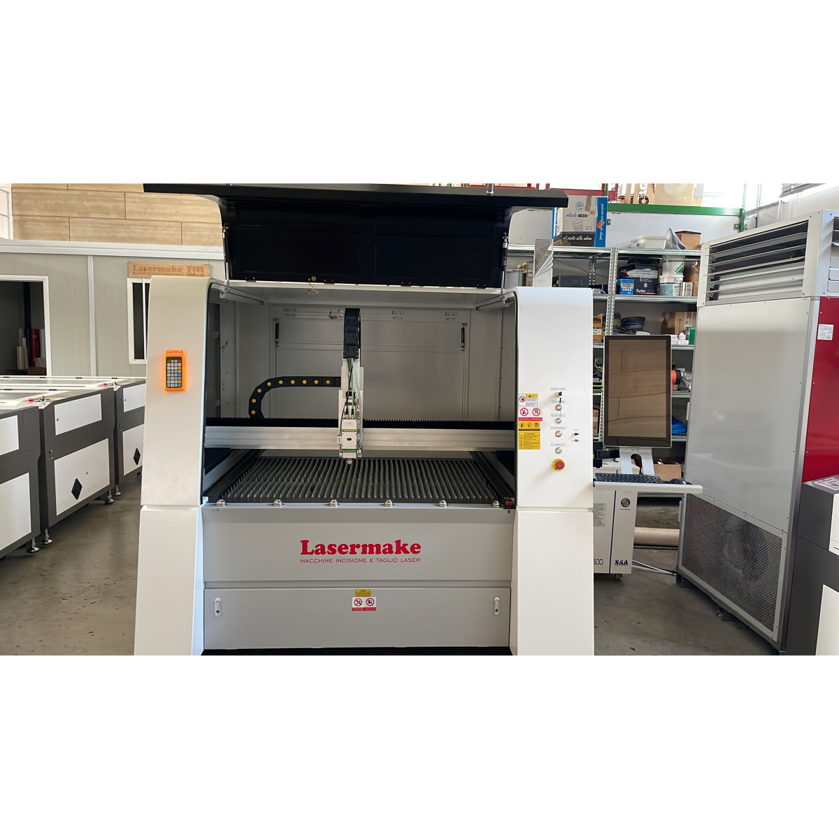 Accessori di serie inclusi: Chiller raffreddamento sorgente, Software, Cavo alimentazione elettrica, Ottiche, Ugelli di ricambio, Sorg. laser, Puntatore laser rosso per posizionamento, Cover protettiva, PC con monitor, tastiera e mouse