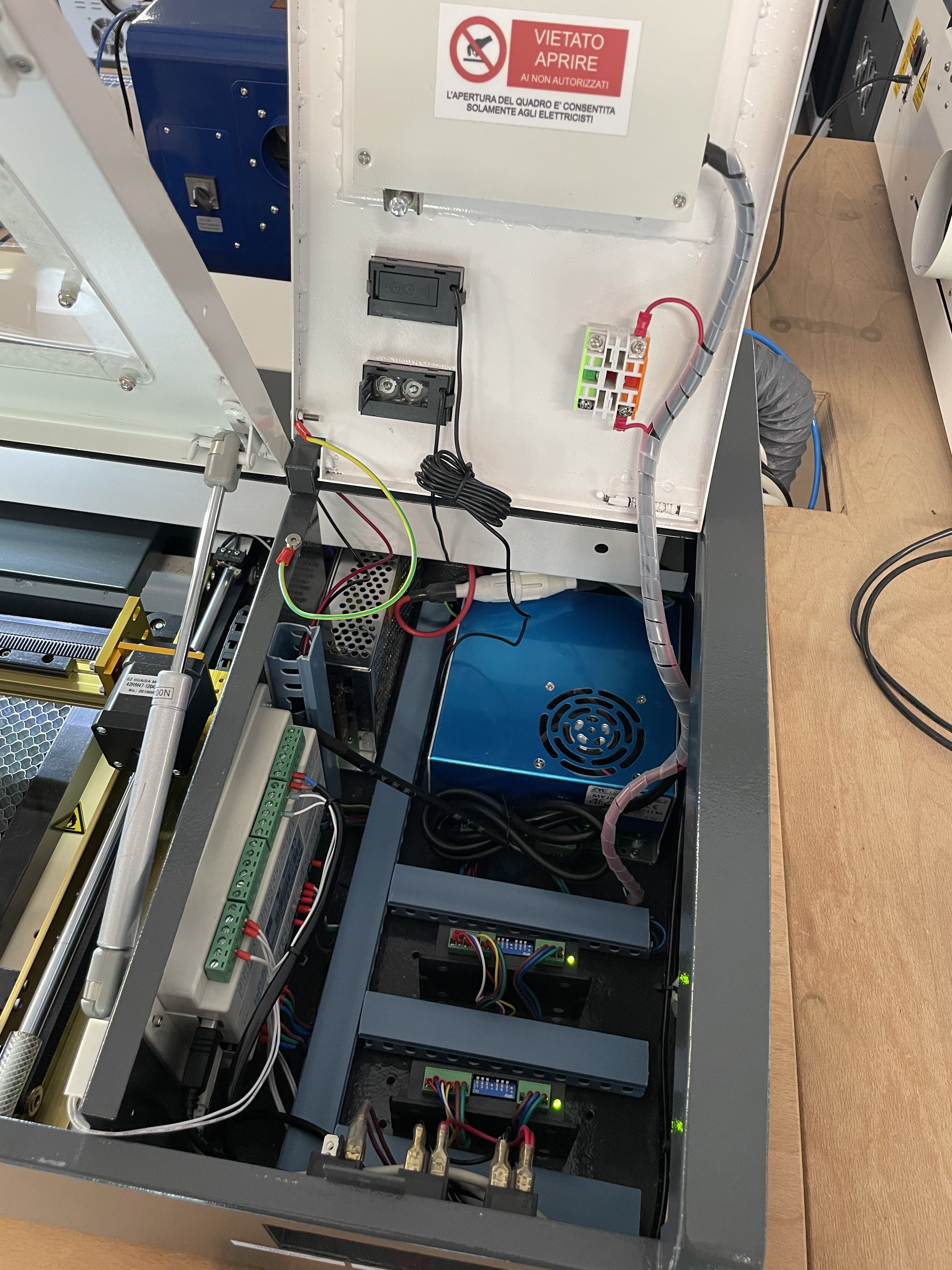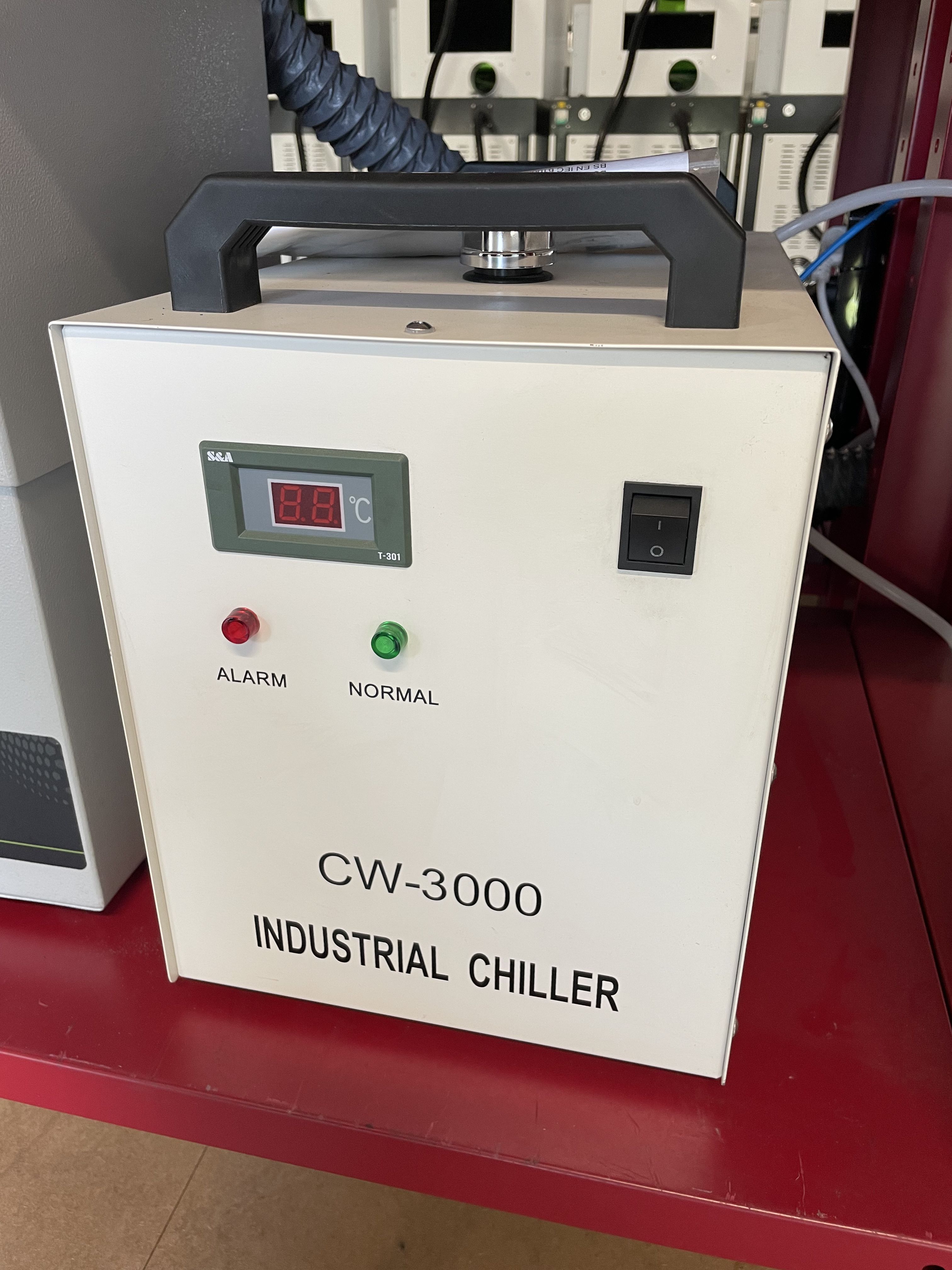 Accessori di serie inclusi CD software e manuali, Pompa ricircolo acqua, Ventilatore estrattore fumi, Soffiante aria, Cavi usb/ethernet, Cavo alimentazione elettrica europeo, Ottiche (3 specchi, 1 lente) installate, Tubo laser, Puntatore laser rosso per posizionamento, Piano: piatto di alluminio