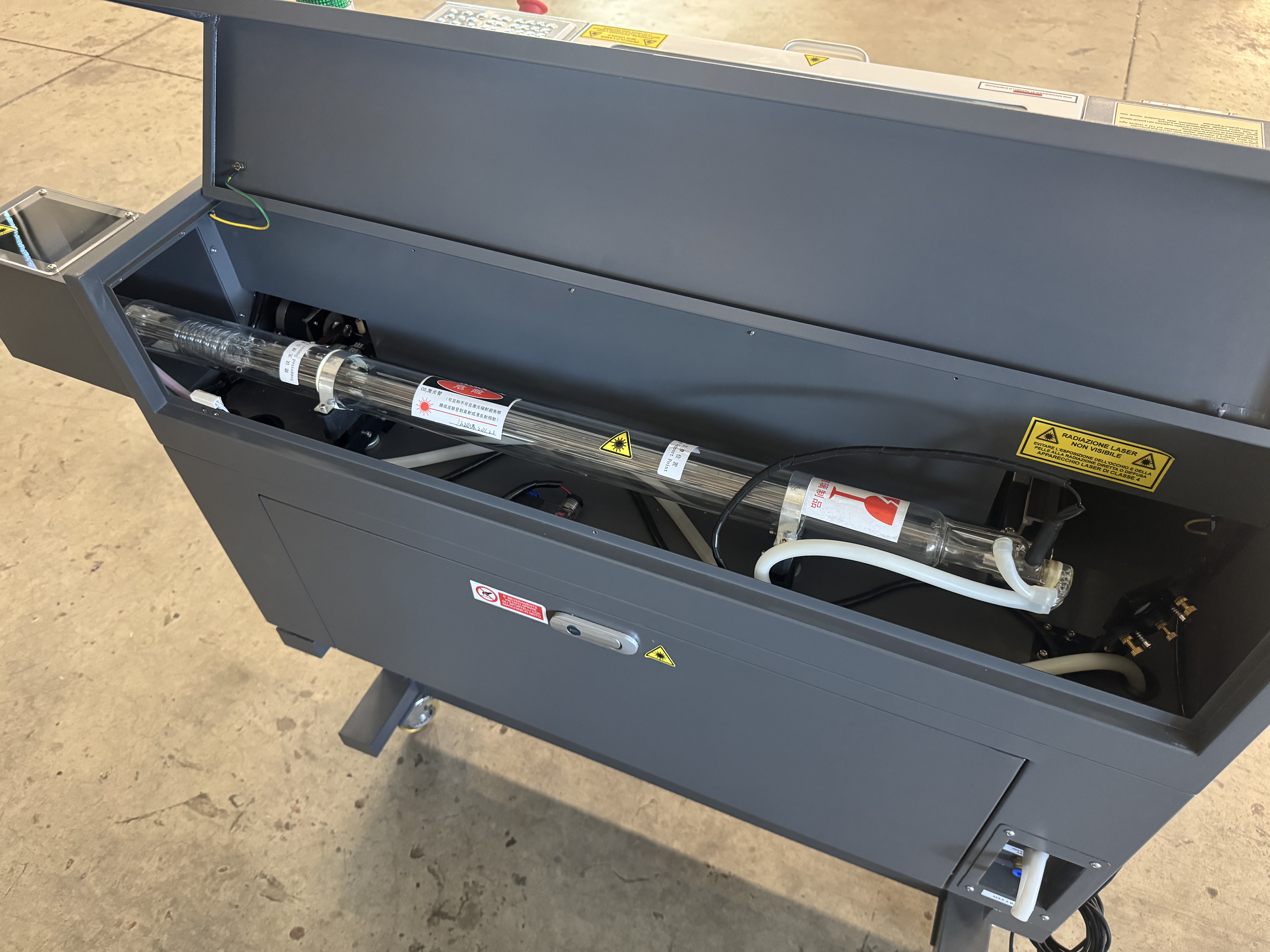 Accessori di serie inclusi CD software e manuali, Chiller ricircolo acqua, Ventilatore estrattore fumi, Soffiante aria, Cavi usb/ethernet, Cavo alimentazione elettrica europeo, Ottiche (3 specchi, 1 lente) installate, Tubo laser, Puntatore laser rosso per posizionamento, Porta Pass-Through, Piano supporto alveolare, chiavi e utensili manutenz.