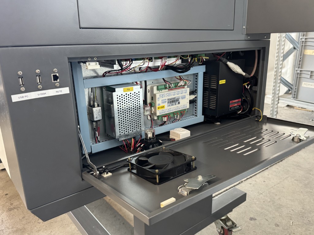 Accessori di serie inclusi CD software e manuali, Chiller ricircolo acqua, Ventilatore estrattore fumi, Soffiante aria, Cavi usb/ethernet, Cavo alimentazione elettrica europeo, Ottiche (3 specchi, 1 lente) installate, Tubo laser, Puntatore laser rosso per posizionamento, Porta Pass-Through, Piano supporto alveolare, chiavi e utensili manutenz.